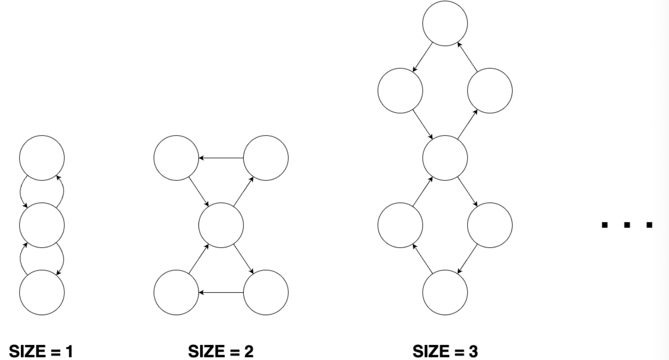 - 크기가 n인 8자 모양 그래프는 2n+1개의 정점과 2n+2개의 간선이 있습니다. 8자 모양 그래프는 크기가 동일한 2개의 도넛 모양 그래프에서 정점을 하나씩 골라 결합시킨 형태의 그래프입니다. 8자 모양 그래프의 형태는 다음과 같습니다.