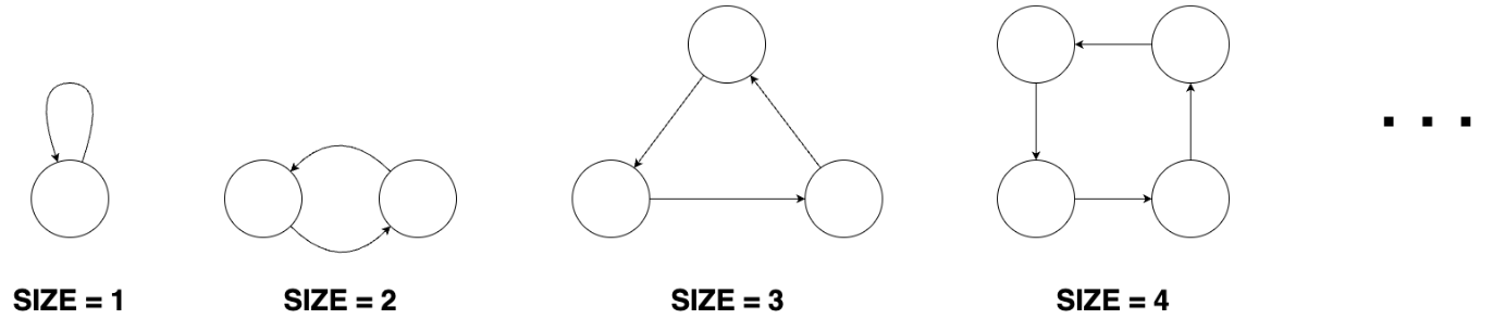 - 크기가 n인 도넛 모양 그래프는 n개의 정점과 n개의 간선이 있습니다. 도넛 모양 그래프의 아무 한 정점에서 출발해 이용한 적 없는 간선을 계속 따라가면 나머지 n-1개의 정점들을 한 번씩 방문한 뒤 원래 출발했던 정점으로 돌아오게 됩니다. 도넛 모양 그래프의 형태는 다음과 같습니다.