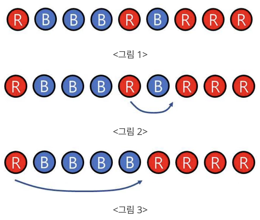 빨간색 볼과 파란색 볼이 <그림 1>에서 보인 것처럼 일직선상에 섞여 놓여 있을 때, 볼을 옮겨서 같은 색 볼끼리 인접하게 놓이도록 하려고 한다. 볼을 옮기는 규칙은 다음과 같다.