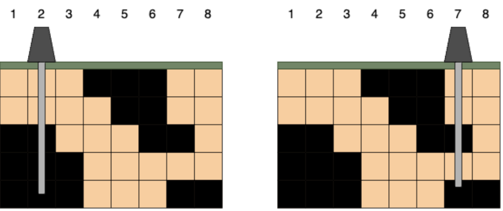 이전에 저장해둔 석유 덩어리 객체들에 포함된 좌표들을 활용해서, 각 석유 덩어리의 좌표 중에서 열 값을 기준으로 시추관 별로 뽑을 수 있는 석유량을 계산했다.
